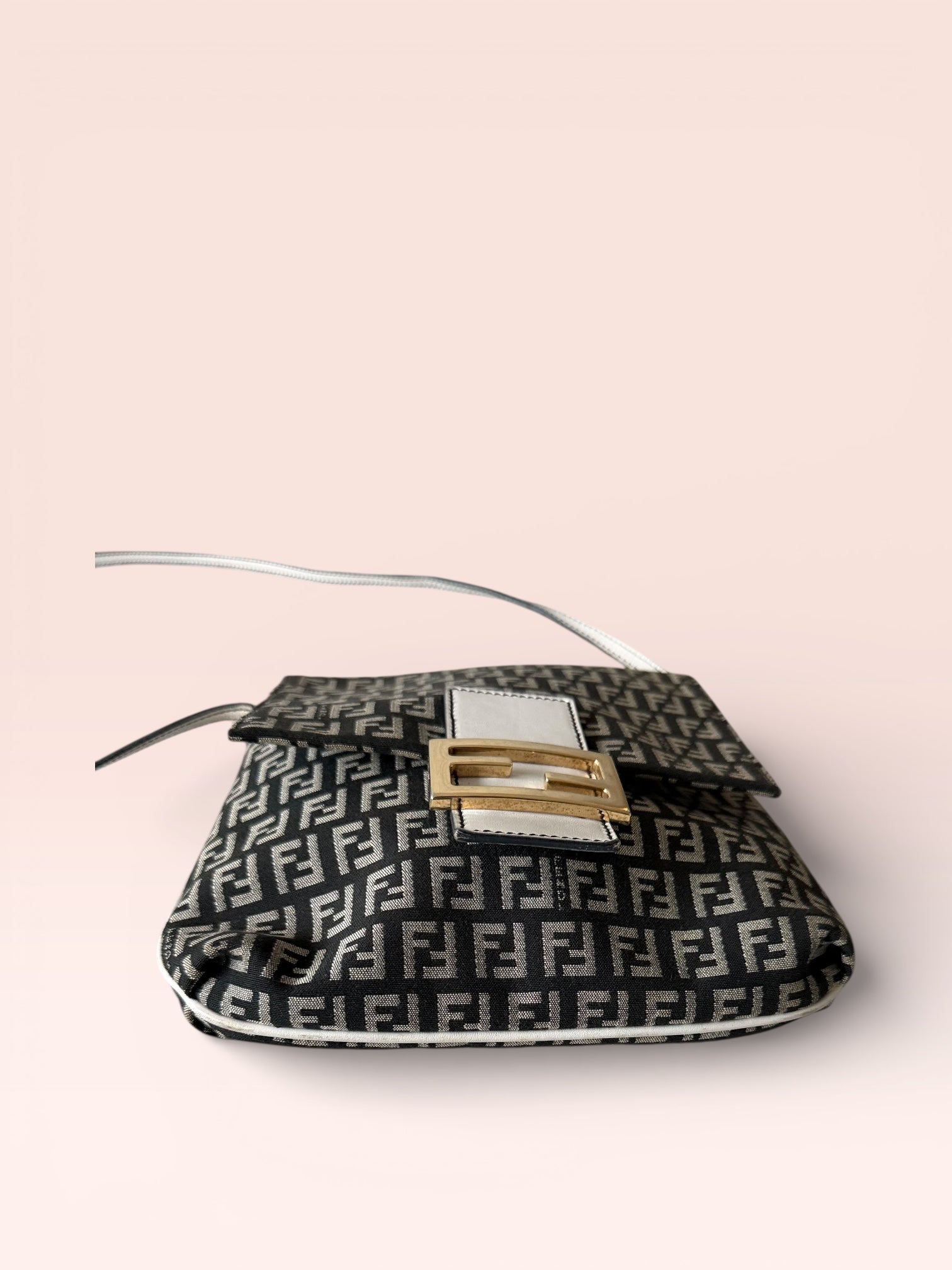 This crossbody bag is versatile, suitable for various outfits. The canvas material ensures durability. Carry it over your shoulder for easy access. The bag's compact size makes it perfect for essentials. A must-have for Fendi enthusiasts.